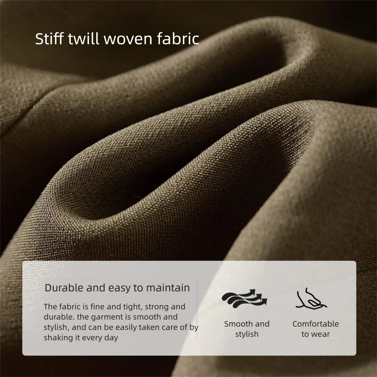 La chaqueta está confeccionada con una mezcla premium de poliéster y spandex. Este material garantiza una sensación suave al contacto con la piel, al tiempo que ofrece una estética sofisticada y durabilidad en el tiempo.
